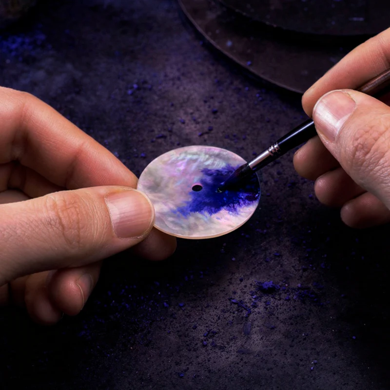 Once the disc is prepared, the coloring phase begins. The pigment is applied with great care to achieve a uniform color while preserving the material’s natural iridescence. It’s a delicate balance: too much color would risk obscuring the depth of the mother-of-pearl. The process is then carried out progressively until the right balance between color and transparency is achieved.