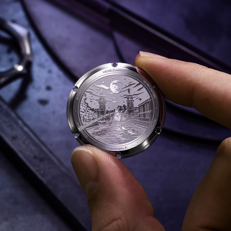 For the Arsenale 37mm, we carefully selected natural mother-of-pearl semi-finished blanks distinguished by a high level of iridescence. After an initial selection phase, the material is cut into a circular shape, thinned, and polished to enhance its depth and natural reflections. Each dial is therefore unique, defined by the intrinsic structure of the mother-of-pearl itself.