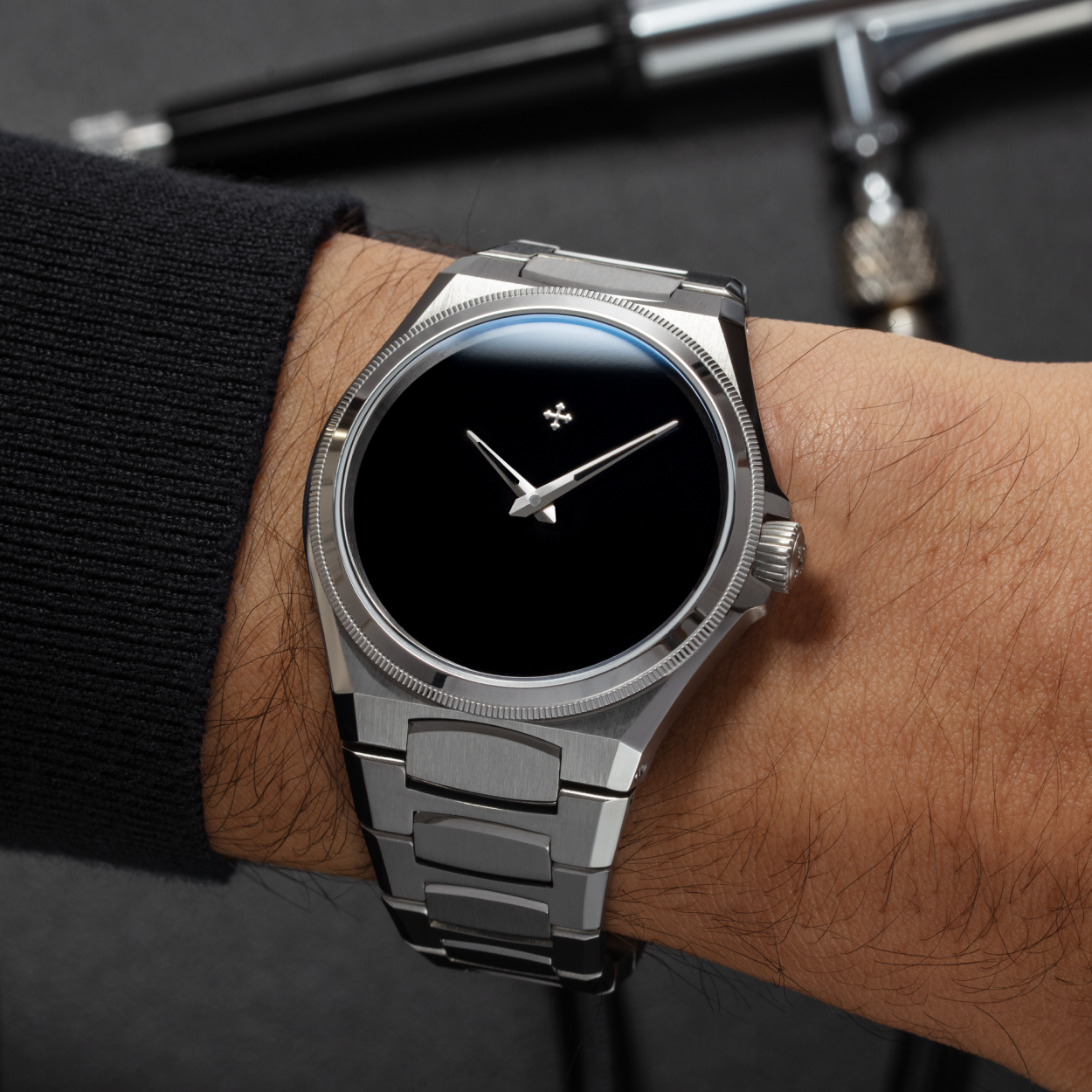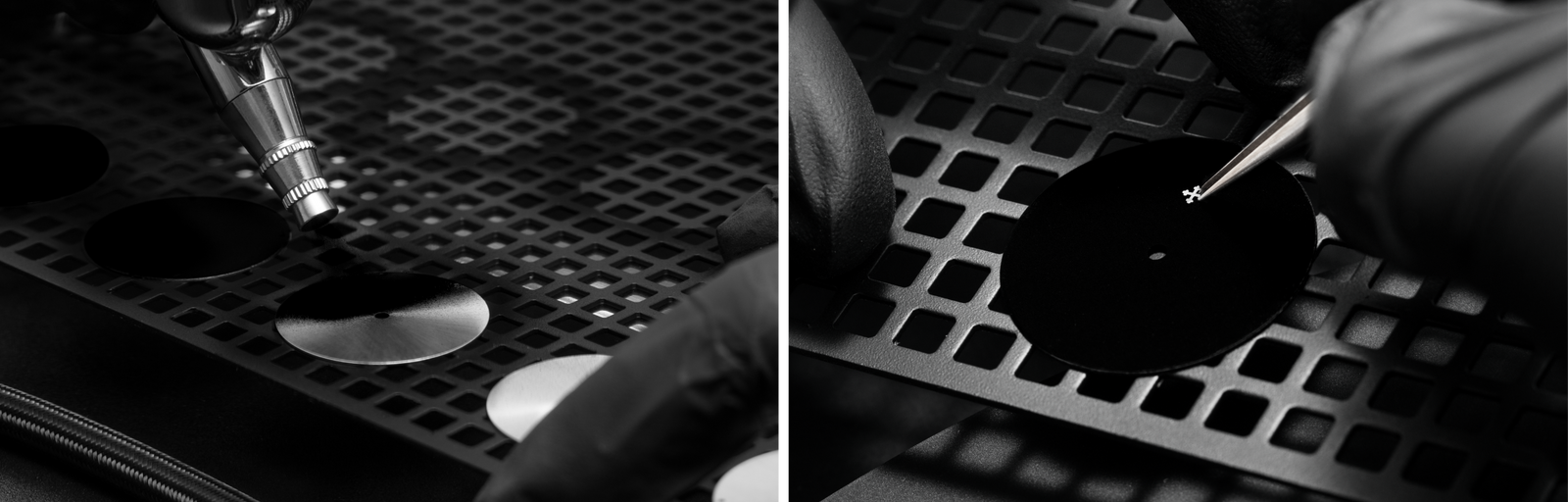 Ultrablack dials are crafted through a meticulous process: brass disks are carefully prepared, and Musou Blackâ„¢ paint, specifically adapted for adhesion to metal, is applied using a fine airbrush to ensure uniform and precise coverage. The drying takes place in a dust-free environment, as even the slightest contact can compromise the finish. Finally, the logo is added with great care, and each dial undergoes rigorous quality checks, as even a light touch can leave a permanent mark.