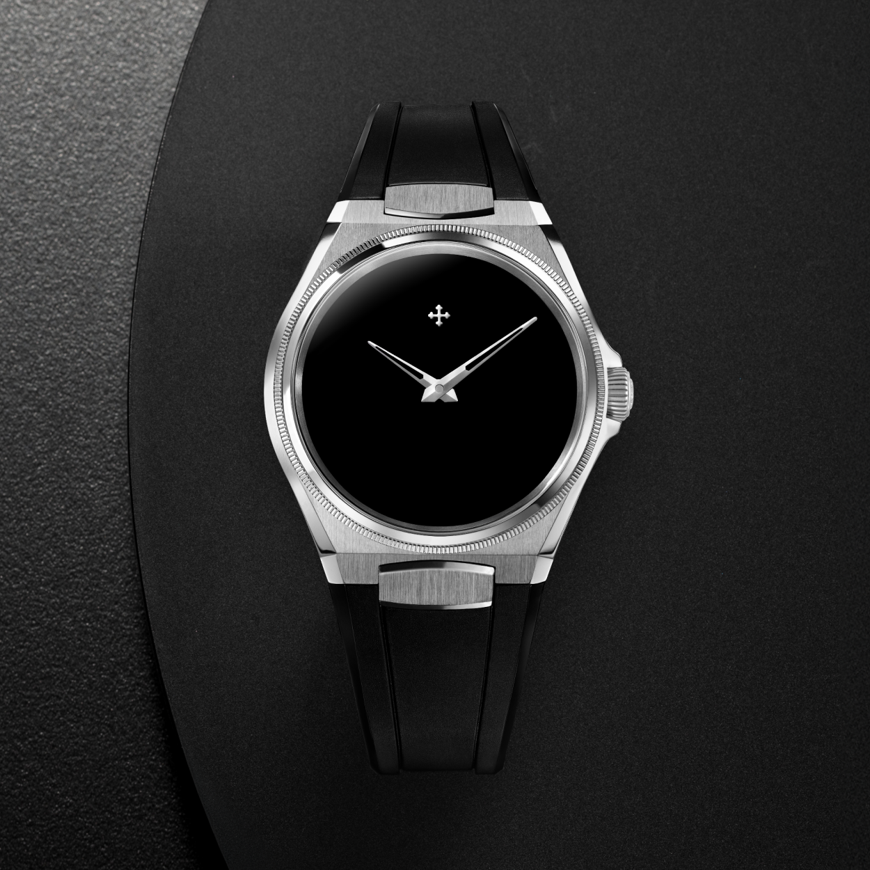 STRAP: Black rubber, dual-finish