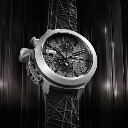 mechanical automatic chronograph movement with technical modifications to U-BOAT specifications. Frequency 28,800 vibrations/hour, 4 Hz. Power reserve 62 hours. 25 jewels. Skeletonized rotor. SW 500 Sellita.