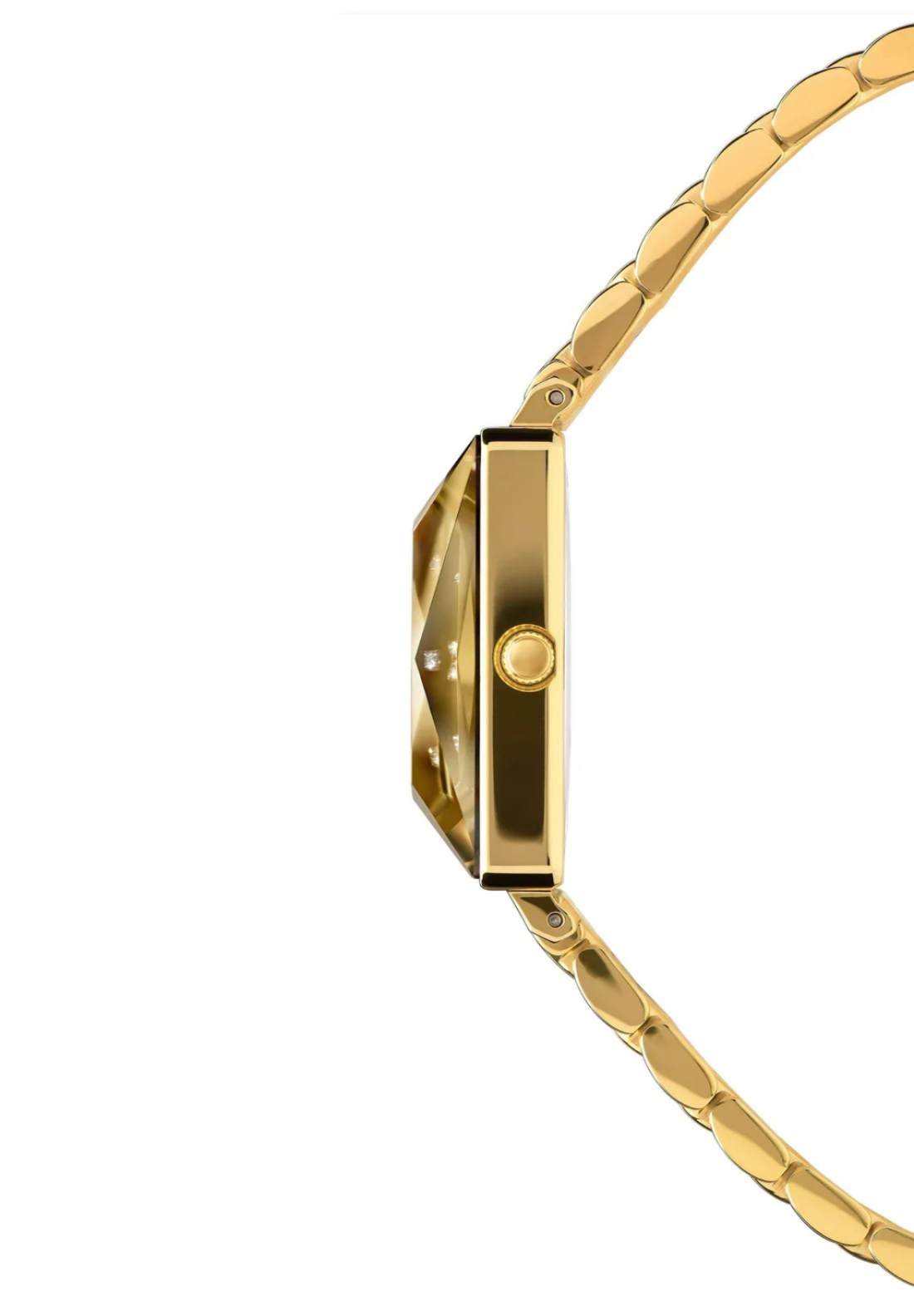 he glamorous Swiss women’s wristwatch impresses with its rectangular 25mm case combined with a round dial. The shimmering gold dial with glittering rhinestones and the elegant gold-coloured bracelet make the watch an exquisite fashion highlight.Product Information