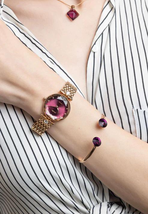Rose gold watches for women are given a style upgrade in the Facet Brilliant collection. This ladies wristwatch stands out with its burgundy dial and its two sparkling gemstones made of Cubic Zirconia. Measuring 30mm in diameter, it is elegantly sized for everyday wear. The watch crystal is a celebration of the round brilliant cut diamond for jewelry lovers everywhere.