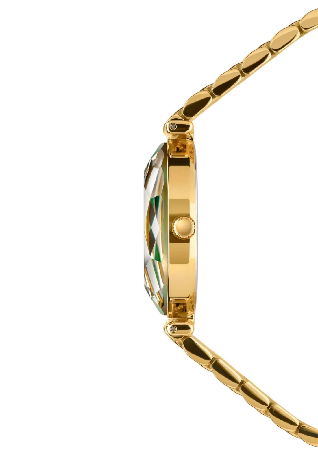 The Facet Brilliant is a gold ladies’ watch with that special something. Handmade in Switzerland, it has a 30mm case and a dial in elegant green. The two glittering cubic zirconia gemstones and the 12 sparkling rhinestones add a noble touch. Named after a cut diamond, this golden women’s watch will add a real glow to your wrist.