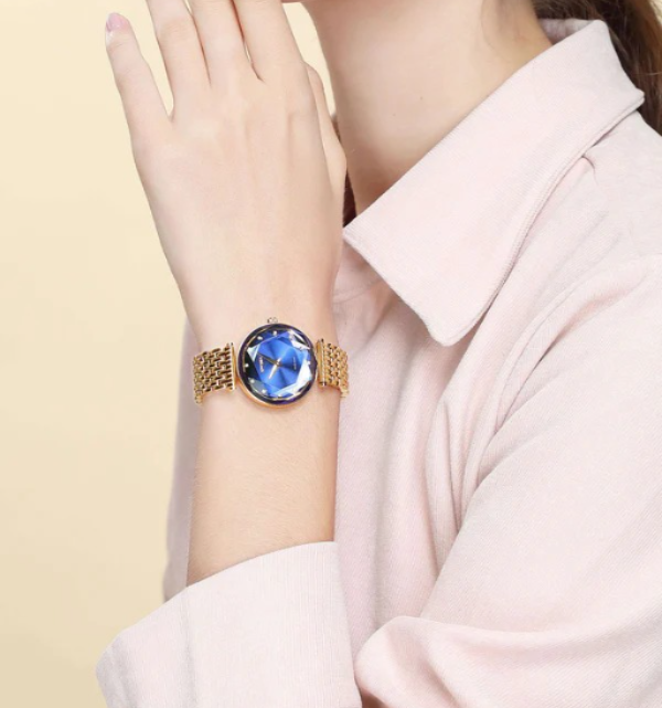 If you’re looking for a blue wristwatch with an elegant jewellery design, the Facet Brilliant with 30mm case is the perfect choice. The specially cut mineral glass sparkles like a diamond and catches the light beautifully. The two decorative elements made of cubic zirconia and the golden stainless steel bracelet round off the high-end look of this ladies’ watch.