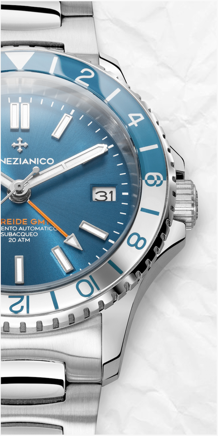 With its 39mm case, Nereide GMT is designed both for those who are seduced by one of the most beloved mechanical complications, and for those who are loooking for a diving watch with unusual color combinations and special mirror and glossy finishes, a distinctive feature of this new collection.