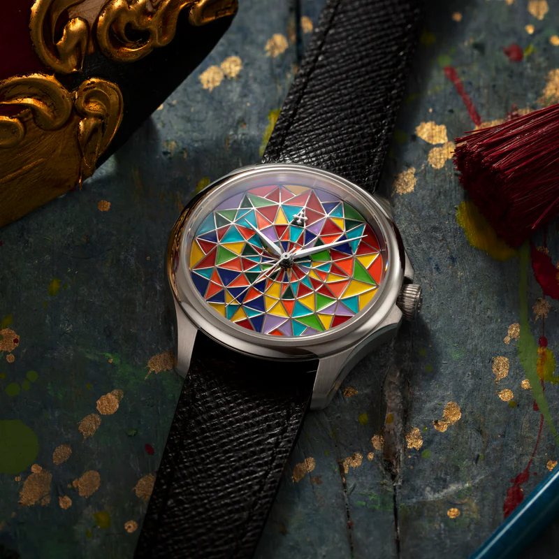 The dial’s construction begins with a base engraved with a precise three-dimensional geometry, designed to accommodate color like a true work of art. Each individual cell is then manually filled with cold enamel, using precision tools and meticulously blending the color, carefully studying the combination of shades to create an ideal balance.