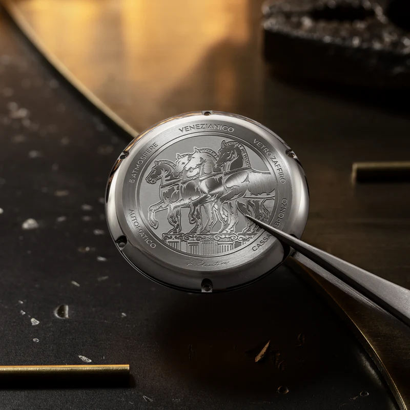 The Redentore Bronzo features a 316L stainless steel caseback, secured with six screws— a choice that prevents the bronze patina from coming into contact with the skin while ensuring long-lasting durability. The engraving draws inspiration from the iconic Horses of St. Mark, a symbol of Venetian art and heritage. A combination of sandblasted and radial satin finishes enhances the intricate details, giving the