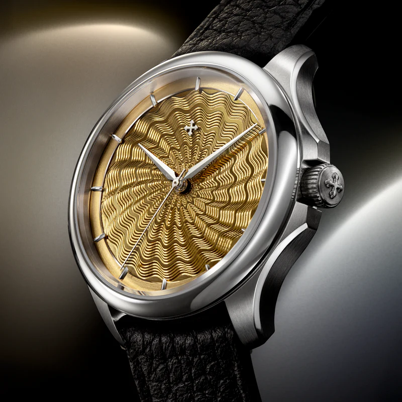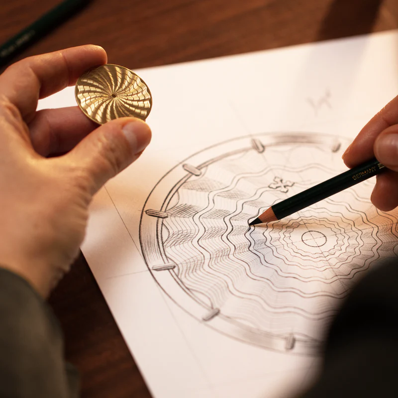 For the creation of the dials, we relied on one of the very few remaining workshops still capable of practising traditional guilloché in its most authentic form. A rare craft, preserved by a handful of masters and historic machines operated entirely by hand, where each engraving is the result of a slow, precise and irreversible gesture. Line after line, micron after micron, the metal is sculpted without any possibility of correction, in a constant dialogue between hand, material and light. The result is not a mere decoration, but a living, deep surface that changes with the angle of observation and makes every dial unique.