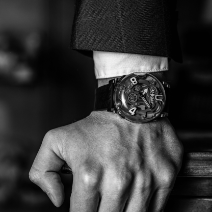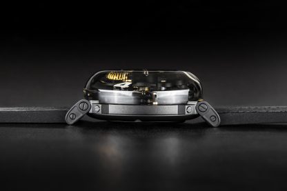 Made from AISI 316L steel. The case is fully filled with a special oil that enhances the dial, creating the illusion of the absence of glass, with a more intense color effect and better readability. A visible air bubble on the dial compensates for temperature changes. Movable lugs. Diameter: 44 mm.
